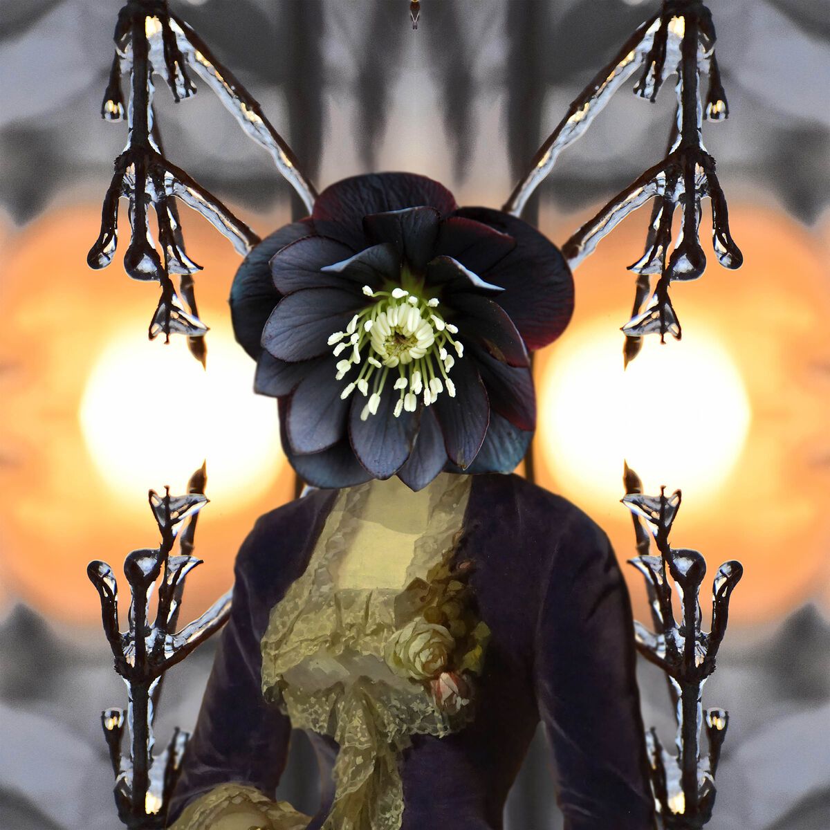 This is one of my Flower Head Ladies. All of the backgrounds are composed of photographs I have taken in my yard, as are most of the "heads." The torsos are from historical portraits.